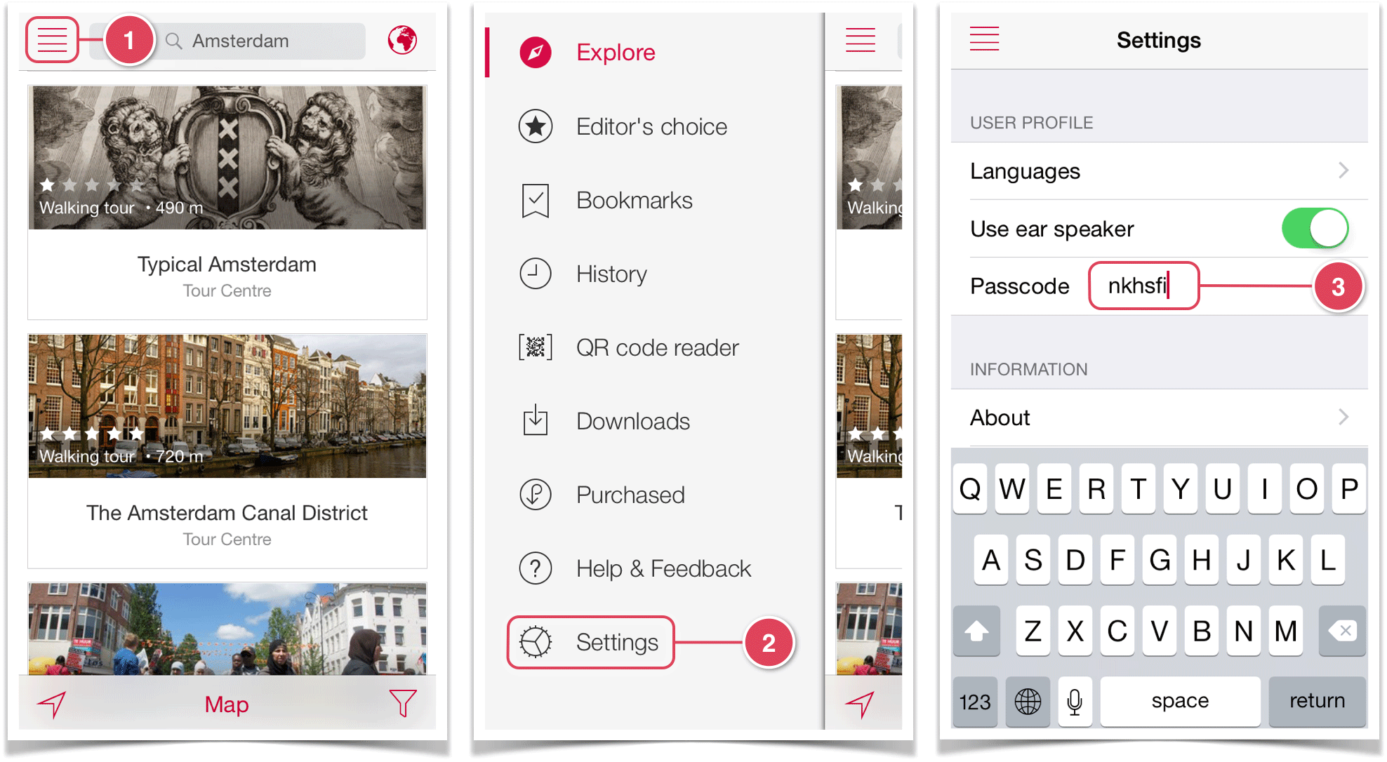 Abra el menú principal de izi.TRAVEL 1, seleccione «Configuración» (Settings) 2 y de la lista de ajustes «Código de acceso» (Passcode) 3. Se mostrará el teclado virtual, utilícelo para introducir la contraseña. Una vez realizada la tarea, el museo recién creado por usted aparecerá en la lista de museos.