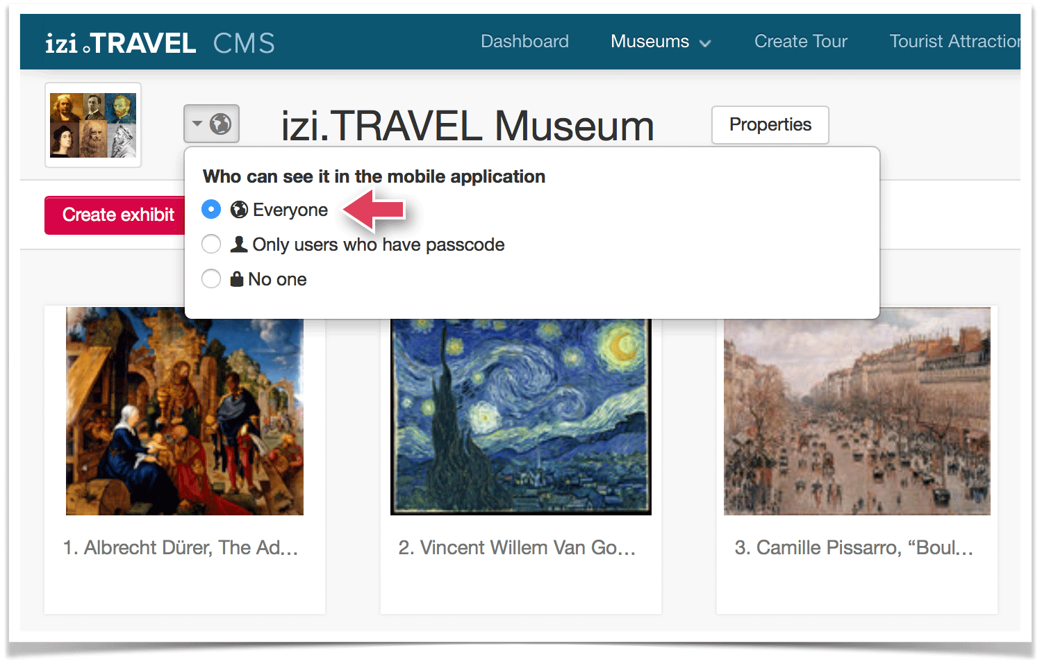 Una vez que todas las tareas de la creación de la audioguía del museo estén terminadas, tendrá que habilitar su acceso para que esté visible en todas las audioguías móviles de izi.TRAVEL.